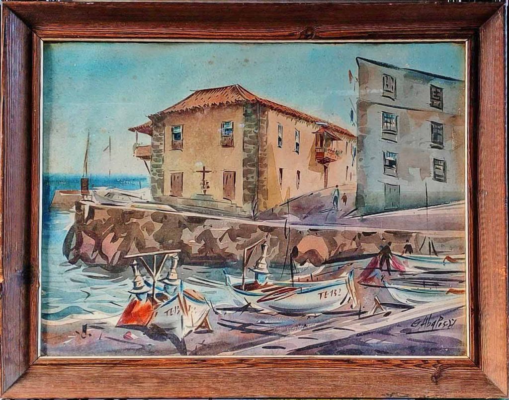 Identificas fácilmente el lugar. Casa de la aduana, Puerto de la Cruz. Por curiosear, salgo a pasear por la red. ¡Mira tú! “Gouache vintage español sobre papel, década de 1970. Puerto marítimo del Mediterráneo en España”.