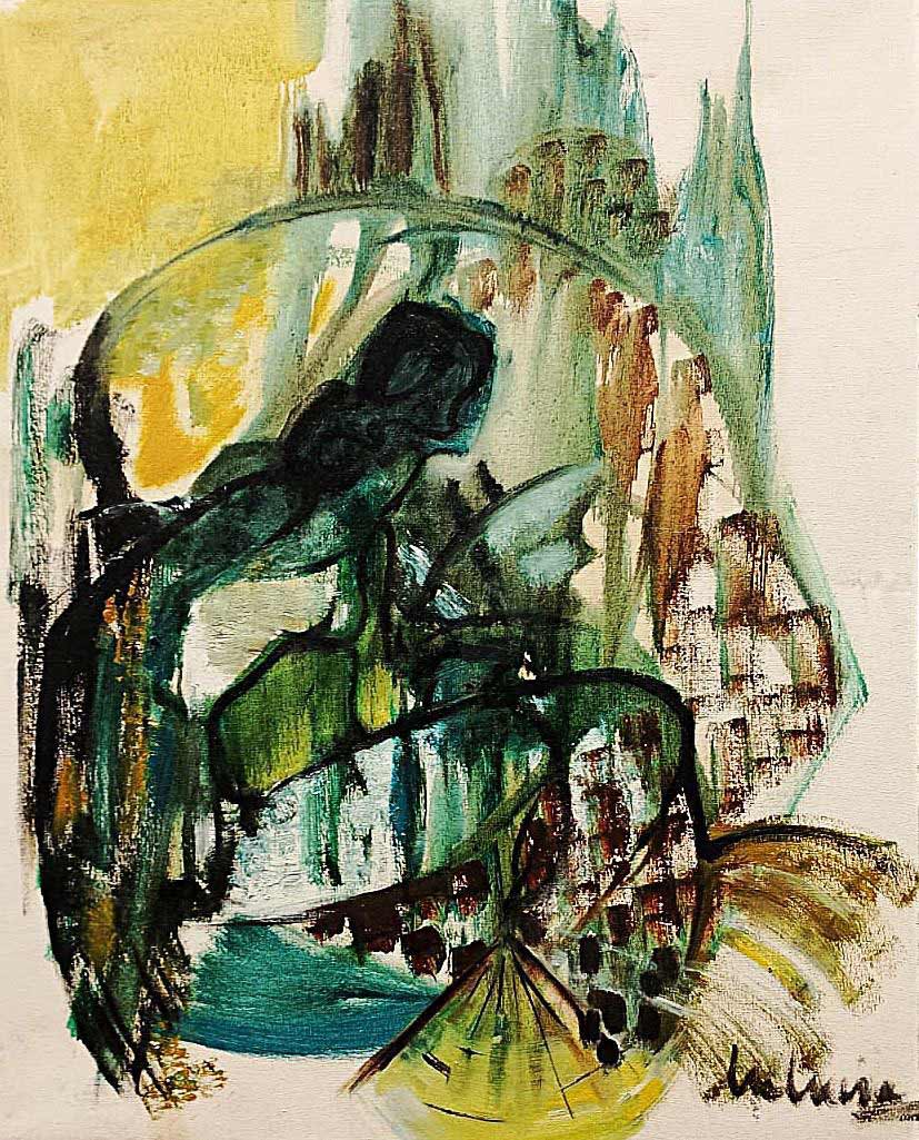 Acrílico sobre tela, 45 x 55 cm. Firmado L. Acosta ’92. Pintura ingenua que no debe leerse técnicamente; es más la intención, el acontecimiento lo que importa.