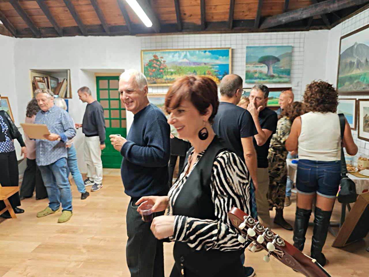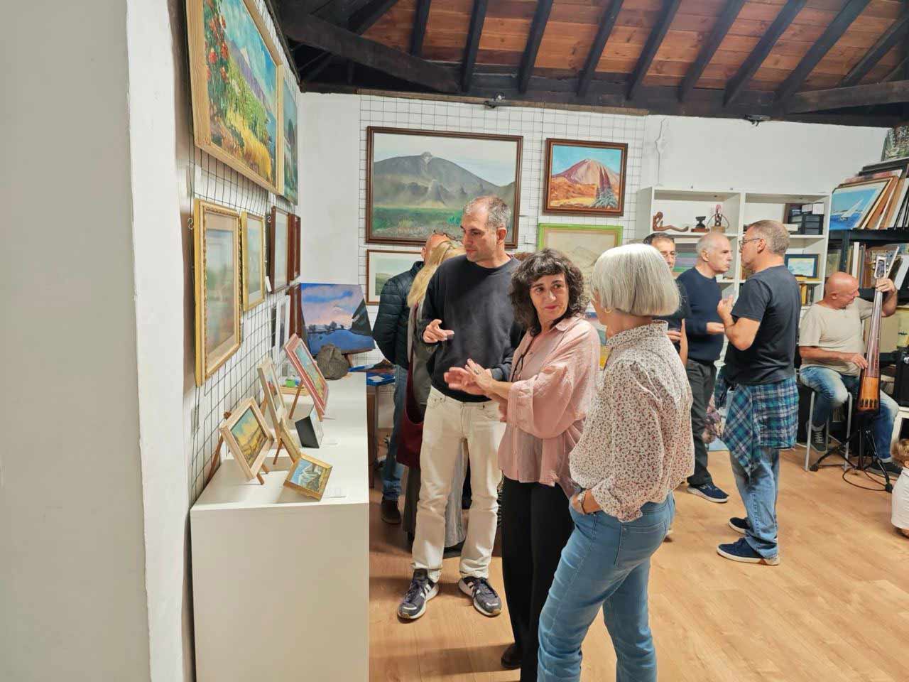 Iba a venir mucha gente y debía sentirse cómoda. Queríamos que la puesta de largo del espacio museístico, coincidiera con un evento señalado. Decidimos celebrar los cien años de la publicación del poemario de Mercedes Pinto, “Brisas del Teide”, y mostrar algunos de los Pico Teide que tiene la colección. Preparamos la lectura de dos poemas del libro de Mercedes, a las voces de Romina Mesa y Silvia Mesa. Abilio Martín hizo de maestro de ceremonias con su porte, su temple y su voz. Antes de dar lectura a un último poema de otro de los libros de la autora, salimos a la calle a descorrer el trapo a cuadros verdes y blancos tipo Vichy que tan bien conjuntaba con la fachada de la casa y que cubría la placa señalética del espacio. Silvia, ese ese acto simbólico/solemne renunció al salón de la vivienda en aras del Museo. Aplausos y vítores. Después, lectura del último poema en la voz de Abilio y luego me cedieron la palabra. Decir que, cada poema, fue acompañado con sutileza y emoción a partes iguales por el bajo de Teyo y la guitarra de José Javier. Yo agradecí la asistencia, la compañía y el acompañamiento y, a continuación, expliqué brevemente, algo sobre la muestra. Después hubo vino tinto del país y galletitas saladas. Dimos tiempo a los músicos, y a Isabel, la voz del grupo, a que preparasen los instrumentos en el bar “La Copa”, sitio emblemático y lugar de copas y noctambuleo en el valle, a treinta metros del museo, calle abajo. Allí acabó la fiesta en una jam session memorable, de bastante más de una hora, que dio paso a las consabidas “arrancadillas” tan de este norte y que te tienen una hora más en el lugar.