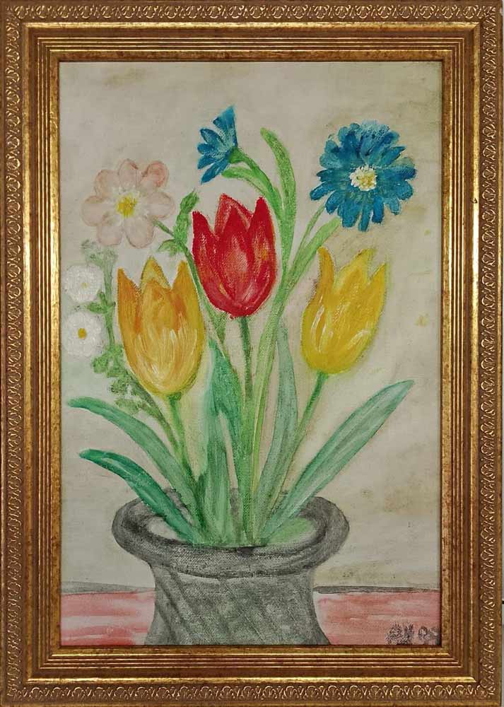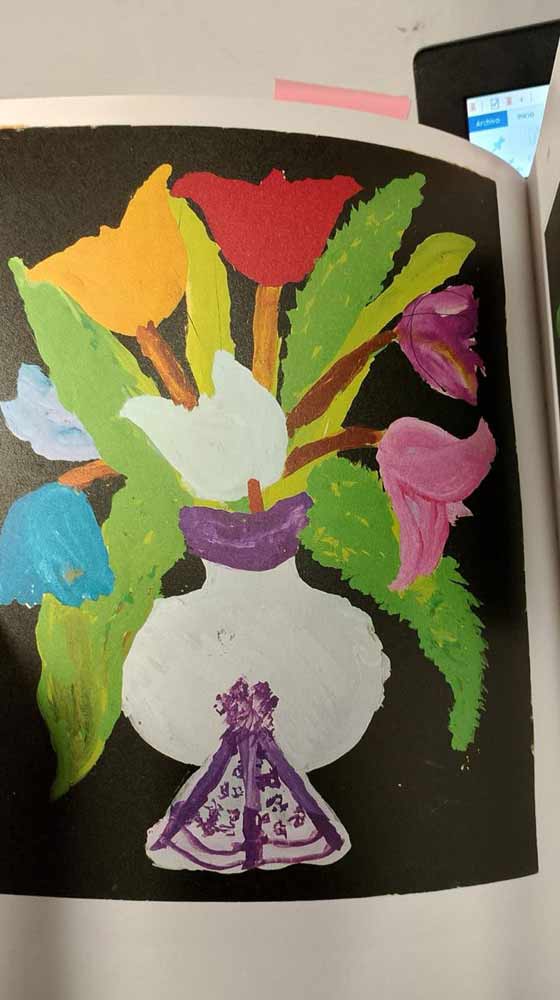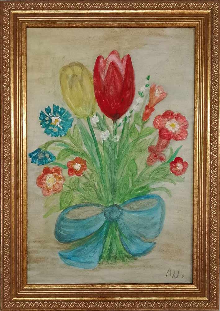 Se aprecian bien marcados los rastros de grafito del dibujo original. Después, Ana manchó la superficie pictórica de manera timorata. Sólo unas pocas pinceladas cargan con suficiente pigmento como para dejar relieve. El fondo también se diluye en la casi nada. Dos piezas aquejadas de anemia pudorosa. Pese a la aparente jovialidad de las flores, que mantienen altaneras su porte, no son ejemplo de alegría, no contagian emoción, porque les falta lustre, vivacidad, contundencia, vigor. Se diluyen como un fantasma que vaga por la alcoba, sin voluntad de molestar. Recuerdan el humo de un pitillo, el humo del hielo seco en un escenario. Evanescentes. Silenciosas. Sin atreverse a alzar la voz. Llaman a la puerta pero no se atreven a entrar. Ahí está, en el umbral.