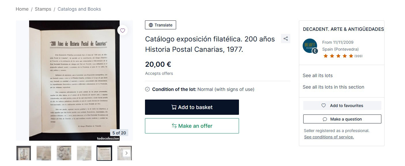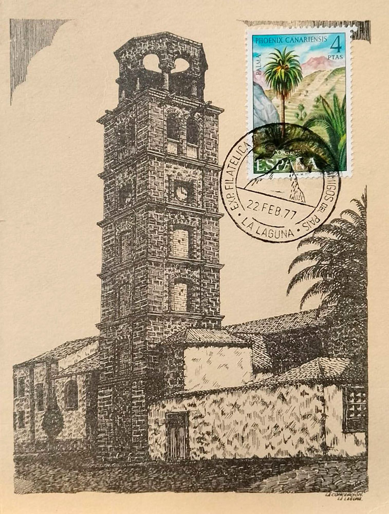 Estos retazos pienso que son de interés para ubicar también el contexto. Estoy encantado y orgulloso de haber recogido el cuadro (la lámina) que me pasó David. Sirve de ejemplo, y ya les he mostrado varios, de la casuística del museo, y de los objetos que llegan a él. Hay pendiente una exposición que titularemos DIDÁCTICA DEL HALLAZGO, en la que las referencias, los errores y también los aciertos, claro que sí, darán una idea de algo que subyace bajo las intenciones más obvias de este proyecto. Dar con la postal que inspiró la lámina, o la lámina que inspiró la postal, es un hecho que, por anecdótico, no deja de tener su interés. Si los maestros en la pintura de alta época se inspiraban en los grabados de los libros, todavía es costumbre la copia. No importa qué fue primero, lo interesante es la multiplicidad, la reproducción, la facultad de tener un rincón de La Laguna en una pared de tu casa, o enviar el recuerdo del sitio vía postal. Seguramente el original estuviera en la exposición filatélica que anuncia el matasellos de la postal, con motivo de los “200 Años de Arte Postal en Canarias”, habida en 1977. Y la postal pudiera haber sido parte del catálogo, o repartirse en la convención inaugural. O no. Ya da lo mismo. De andar mejor de fondos, el Museo hubiera adquirido el catálogo de dicha exposición, pero con la imagen que les nuestro del mismo y estos dos objetos en el museo, es suficiente.