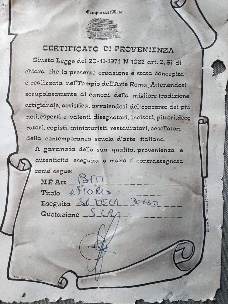 La imagen es un «Certificato di Provenienza» (Certificado de Procedencia) de una obra de arte, emitido por el «Tempio dell’Arte» en Roma. Este documento certifica la autenticidad y origen de una creación artística.