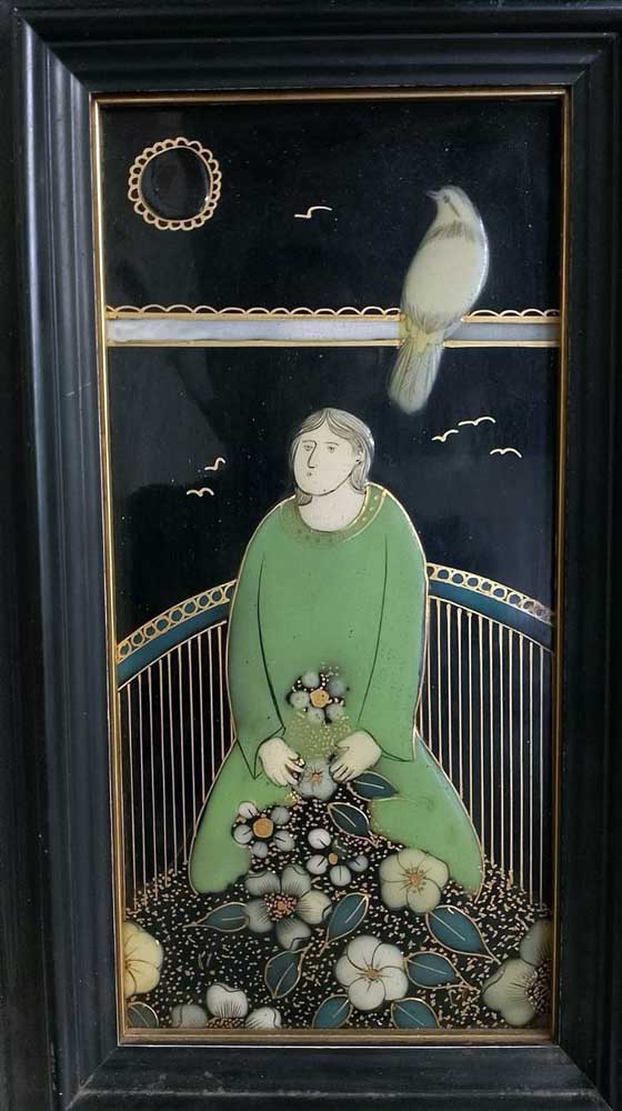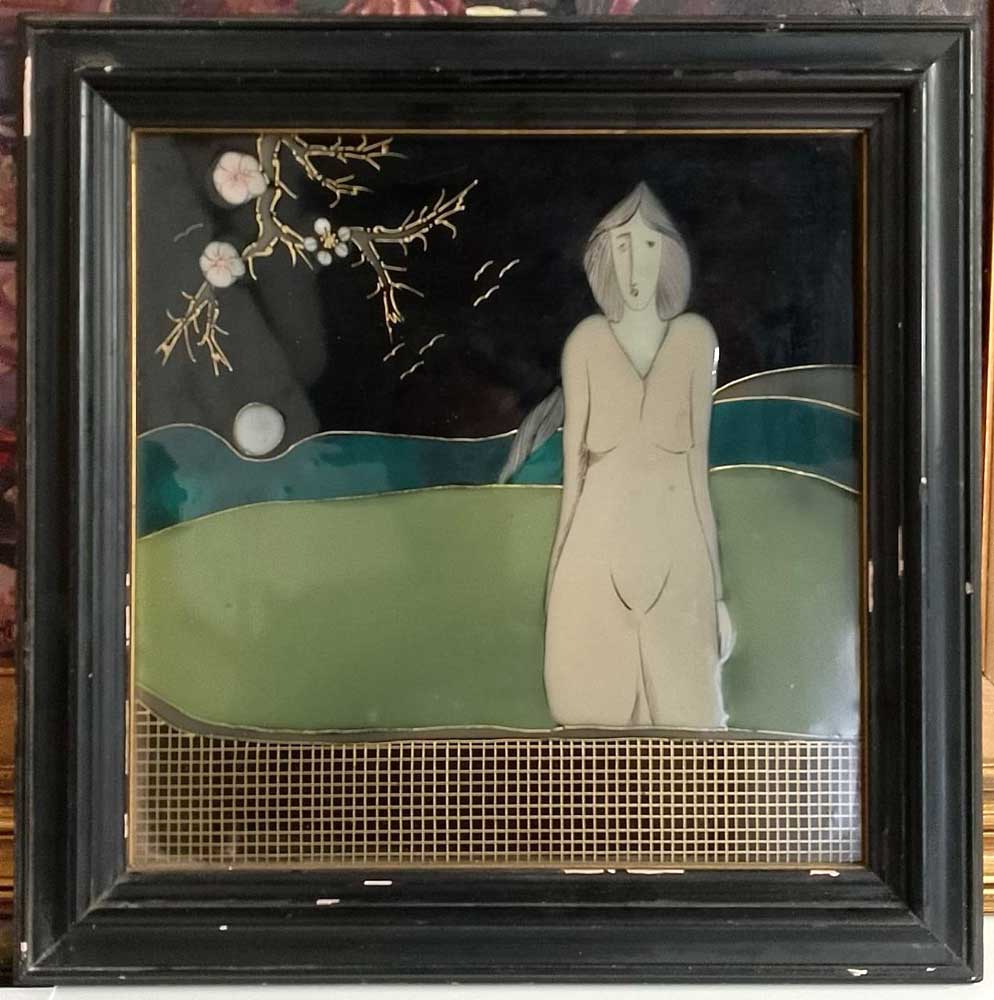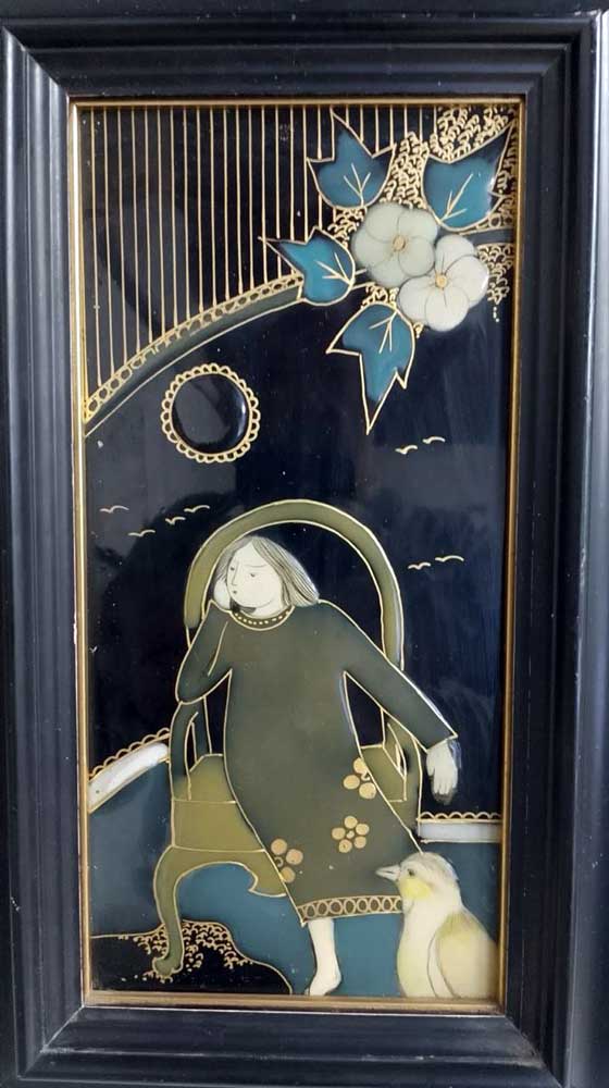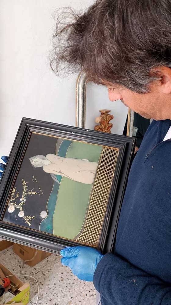 Han ingresado seis obras de golpe en la colección de arte abandonado. Proceden de alguien que se dedica a vaciar casas. Como conoce el museo, me llamó. Les anticipo estas tres. En una imagen aparece el restaurador en plena pesquisa para descifrar de qué tratan los tres objetos. Parece ser que son “chinoiseries”, piezas elaboradas con laca (a la usanza china) con motivos orientales, pero hechas en Europa hacia el primer cuarto del siglo pasado. Un pastiche con trazas de art noveau tardío, hecho sobre madera lacada y decorada manualmente con esos motivos naturalistas. El cuidado en la elaboración, así como el enmarcado elegante y el remate en tela de la parte posterior, indican que son objetos artísticos decorativos y originales, de alta gama para una casa en consonancia, que es de la que me cuenta mi amigo que salieron estas piezas. “Yo te hago el favor de vaciar la casa con mi furgón, tú me das todo lo que no quieras y yo intento ganarme algo con todo eso”. Esa es la cadena de sucesos. Mi amigo de la furgoneta me llama para ofrecerme el paquete del cual muestro hoy esas tres delicatessen. Yo las recojo admirado y pienso en la foto que me mandó mi hermano. Chasco los dedos, y sigo aquí. Los chasco de nuevo y todavía permanezco. Todavía no estoy en una bolsa de basura.