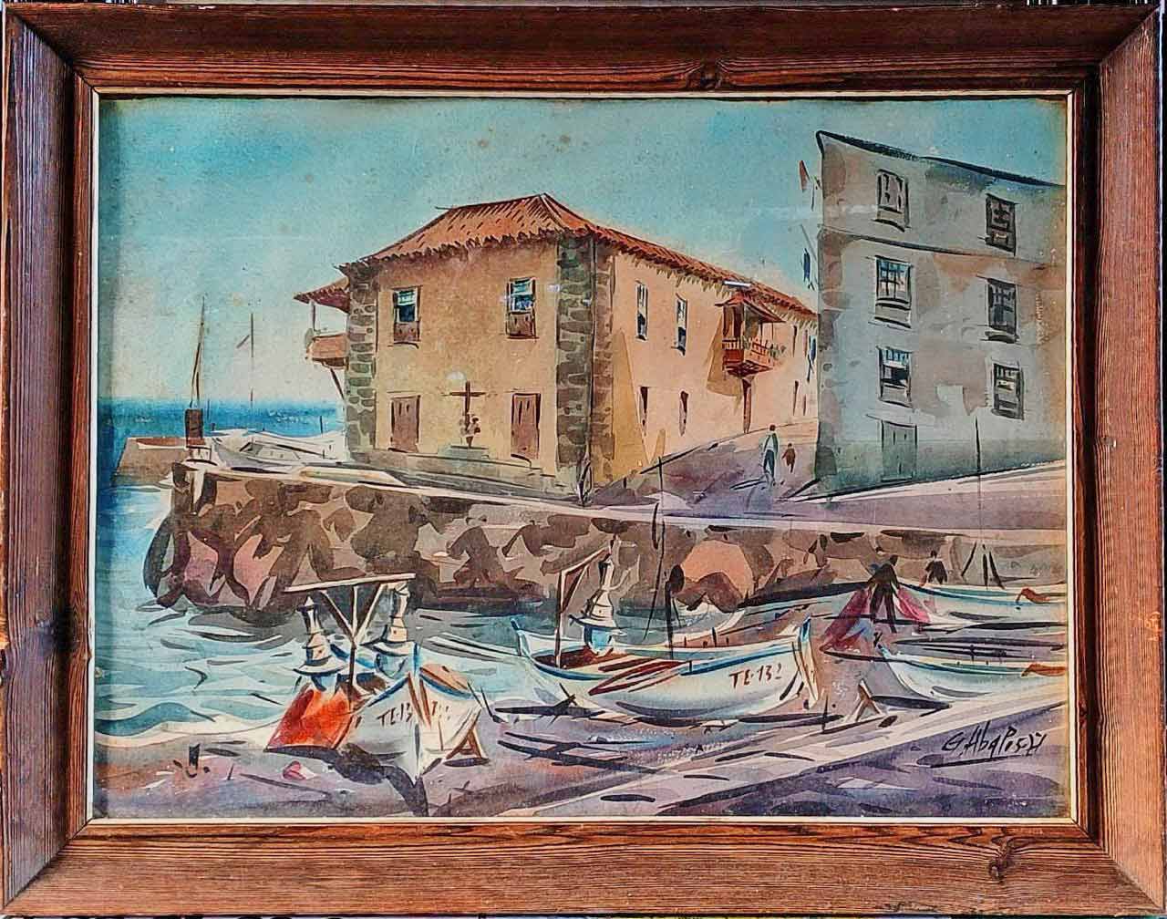 Identificas fácilmente el lugar. Casa de la aduana, Puerto de la Cruz. Por curiosear, salgo a pasear por la red. ¡Mira tú! “Gouache vintage español sobre papel, década de 1970. Puerto marítimo del Mediterráneo en España”. A 74,45 euros que la venden, el papel doblado y sin enmarcar. A eso debes añadir los gastos de envío. La vende Danda Productions, una galería online con sede en New York. ¡Recontramiratú! La firma se aprecia claramente: G. Abalos ’77. Ya tenemos autoría, pero ni jota del artista. Bueno… Indagando, indagando… “Abalos fue todo un personaje en el Puerto. Muchas acuarelas le vi romper al no poder plasmar el color que quería. Tardó bastante tiempo en adaptarse al colorido y la luz del Puerto. Aunque de Cuenca, su vista estaba adaptada al smog y los colores plomizos de Gerona. Sus acuarelas pintadas en invierno eran bastante buenas”. Texto encontrado en el Facebook de Fotos Antiguas de Tenerife, en una post donde se comentaba otra vista del Puerto firmada por Ábalos. Ahora les pediré que piensen un minuto en la de horas que paso ante la pantalla del ordenador rastreando información de cada pieza… Esta vez hubo suerte.