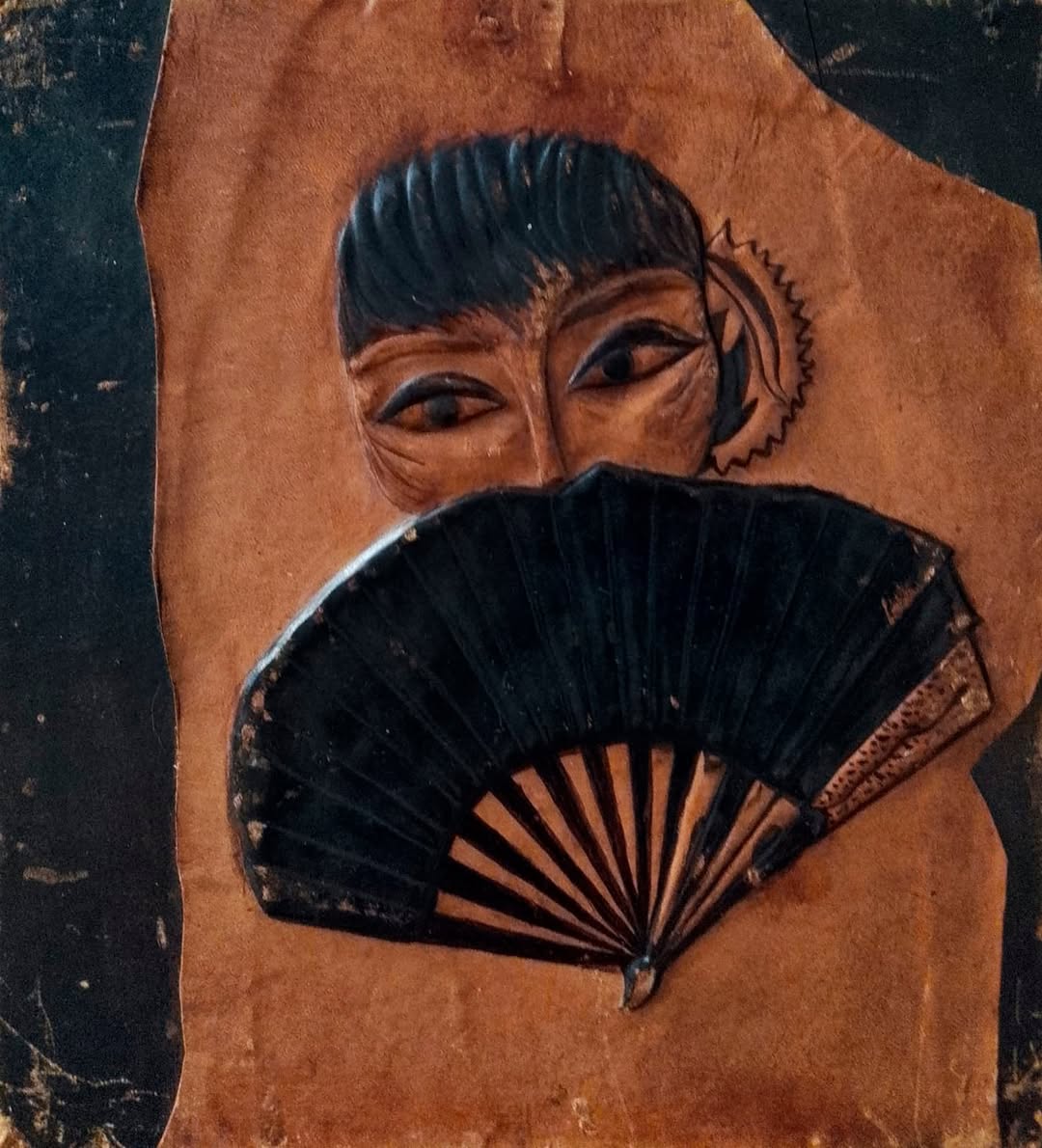 “El objeto en la imagen parece ser un cuadro o una pieza de arte de técnica mixta, que combina elementos tallados y aplicados sobre una base de cuero o material similar. La obra representa a una figura con un abanico negro que le cubre la parte inferior del rostro. La pieza tiene un estilo que podría ser de origen artesanal”.