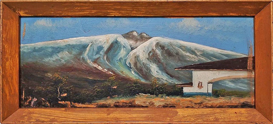 La misma persona que me da los cuadros, me cuenta la historia. Trabaja de enmarcador y conoció al autor, pero sólo recuerda su apellido. Campillo, era. “Iba mucho a los guachinches, comía y bebía a cambio de una obra. Mucho, iba, mucho. No era el único”. Más allá de esa anécdota que es más que anécdota, a mí me fascinan las piezas. Pinceladas cortas, bien nutridas de pigmento en su mayoría. Sabía muy bien dónde manchar. Estas obras no le ocuparían más de veinte minutos cada una. Rápido, con sentido. Una es el Teide y la otra el Puerto de la Cruz, me dice el hombre. Respecto al Teide no hay duda; en cuanto al Puerto… Ni idea. Estoy a la espera de noticias de personas más doctas que yo.