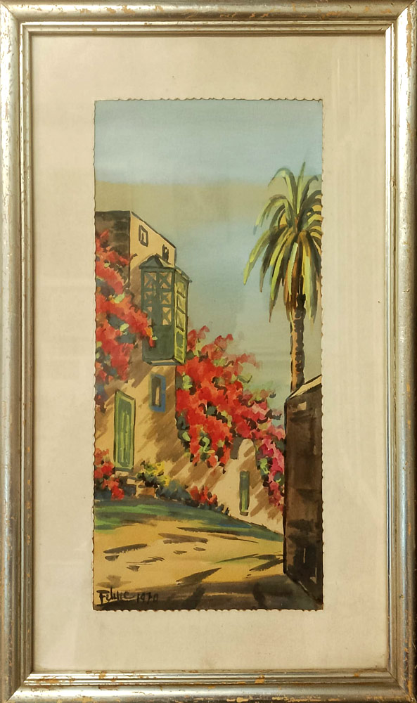 Miren, en la red está toda la documentación, y más, sobre el lugar, así que ya saben dónde mirar si lo desean, que yo estoy agotado ya. Les traigo una acuarela firmada Oramas, parece. 33 x 27 cm. aproximadamente. Fue la primera vista de este lugar emblemático en llegar a la colección de arte abandonado. Todavía dormitaba en la carpeta de “nuevos”, sin catalogar ni comentar. Como es un tema ligerito, hoy es el día. Recuerdo que meses después caí en la cuenta que en la pequeña biblioteca de libros canarios, tenía yo el de José Luis García Pérez, en cuya portada luce una acuarela de Elle du Cane del mismo sitio. El prólogo es de Andrés Chaves, un tipo que me provoca ligeras arcadas, como el Pomares. Me dicen que esto último no lo debo decir, que perjudica al museo; pero es que callar me perjudica el hígado; así que digo. Ya callé lo que me ocurrió el otro día en una conferencia a la que asistí en el Puerto de la Cruz. Pelillos a la mar… La tercera imagen es de otra acuarela que hace poco un vecino donó al museo. La comenté en su día, y la honda impresión que me provocó saber quién era el autor.