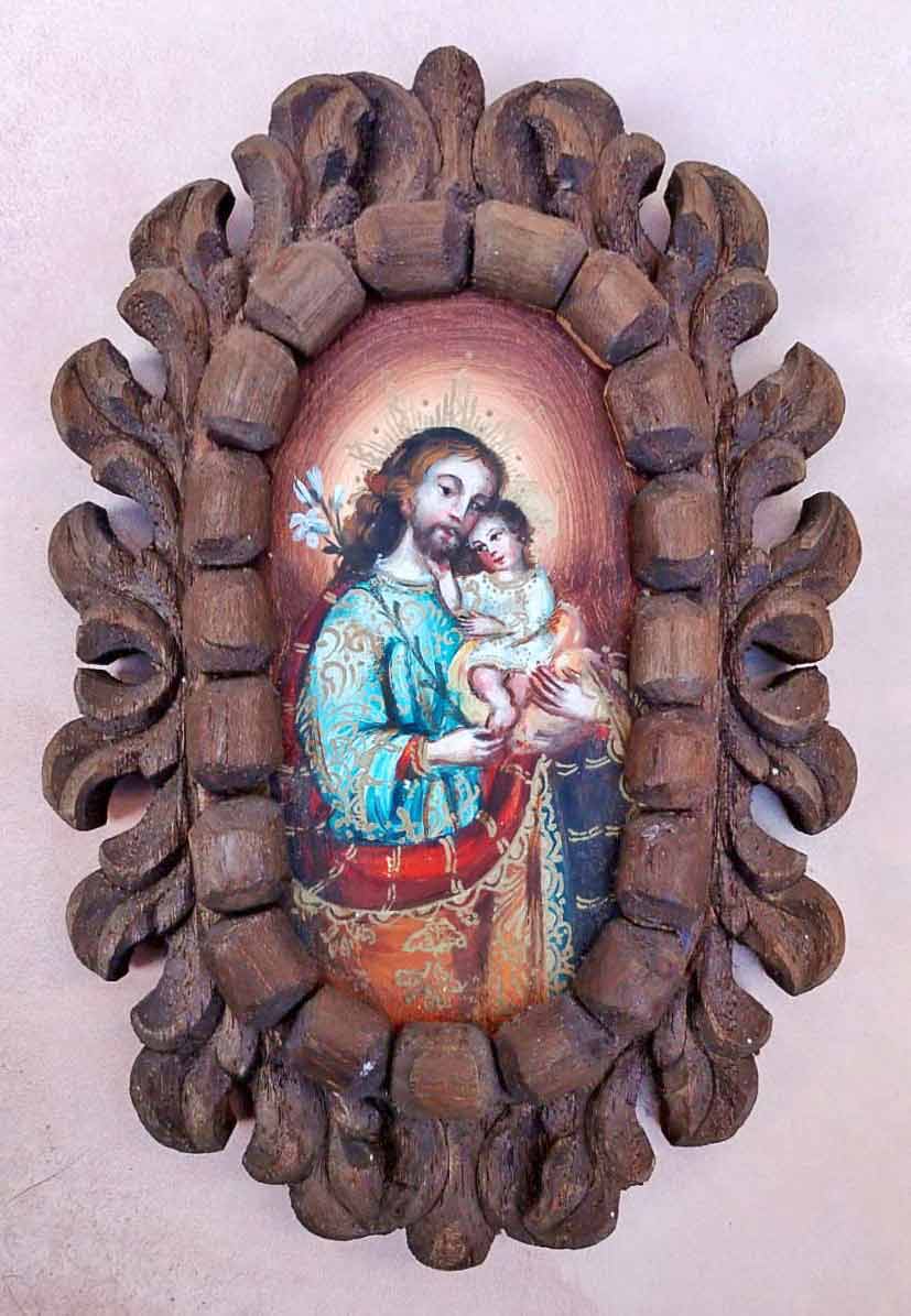 Dicho lo dicho, el objeto me parece hermoso. Sencillo y barroco. Humilde y extremo. Pensé que la mano que aparece por la diestra era la que entrega al infante, pero no, es la del propio padre que lo acoge. Bueno, no vamos a rasgarnos las vestiduras por el mero formalismo de un quítame allá esas pajas. La pieza tiene su mérito. Como mérito tienen las miniaturas. Ya hablé no hace mucho de mi afición a las mismas como buen miope que soy. Como pintura, está bien resuelta y cumple sobradamente su misión, incluso la de un coleccionista marginal y ateo como la mía. El marco me vence. Aparte de la talla, están los cabujones semicilíndricos al más puro estilo “tramp Art” (folk art of the 19th and 20th centuries utilizing recycled found materials, as cedar or mahogany cigar boxes, shaped into containers, lamps, picture frames, or other objects by a technique involving the gluing or nailing together of successive thin layers of wood that are then whittled into intricate geometric designs to produce a protruding multifaceted Surface). Utilicen el googletranslator para estas líneas en un idioma extraño, les prometo una aventura apasionante. Eso, si superaron mi posicionamiento político ante el colonialismo o la religión, y llegaron hasta el texto en inglés.