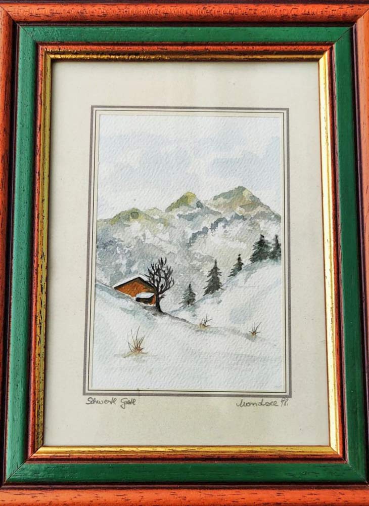 Les dejo con una acuarela que todavía tengo que ir a recoger. Por detrás, está la historia… “Un saludo desde Mondsee para Vd. Familia Handl en España. De fam. Schwerts Gusti”. Somos, también, o básicamente, relaciones. Incluso si están en la Alta Austria, que eso queda lejos del carajo, y escriben la dedicatoria a máquina y luego la pegan en el marco… Sin alguien que nos ad-mire, del otro lado, ni existimos. Sin alguien a quien admirar, casi que tampoco.
